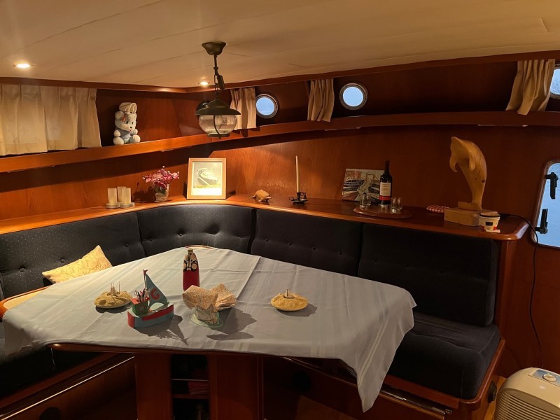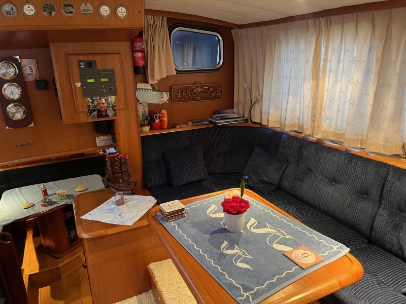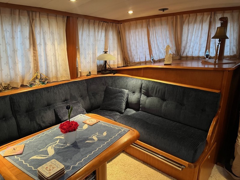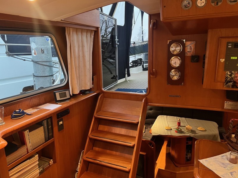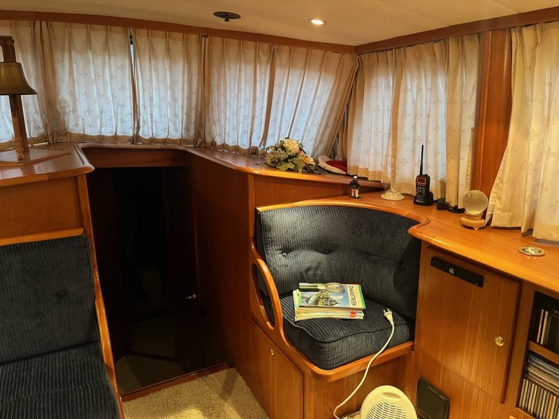 Das Steuerhaus ist geräumig mit einer L-förmigen Sitzgruppe an Backbord und einem Sitzbereich an Steuerbord. Ebenfalls an Steuerbord befindet sich ein Kleiderschrank mit ausfahrbarem Fernseher.