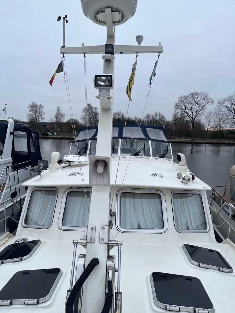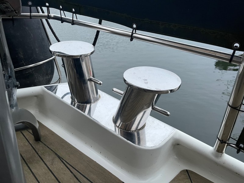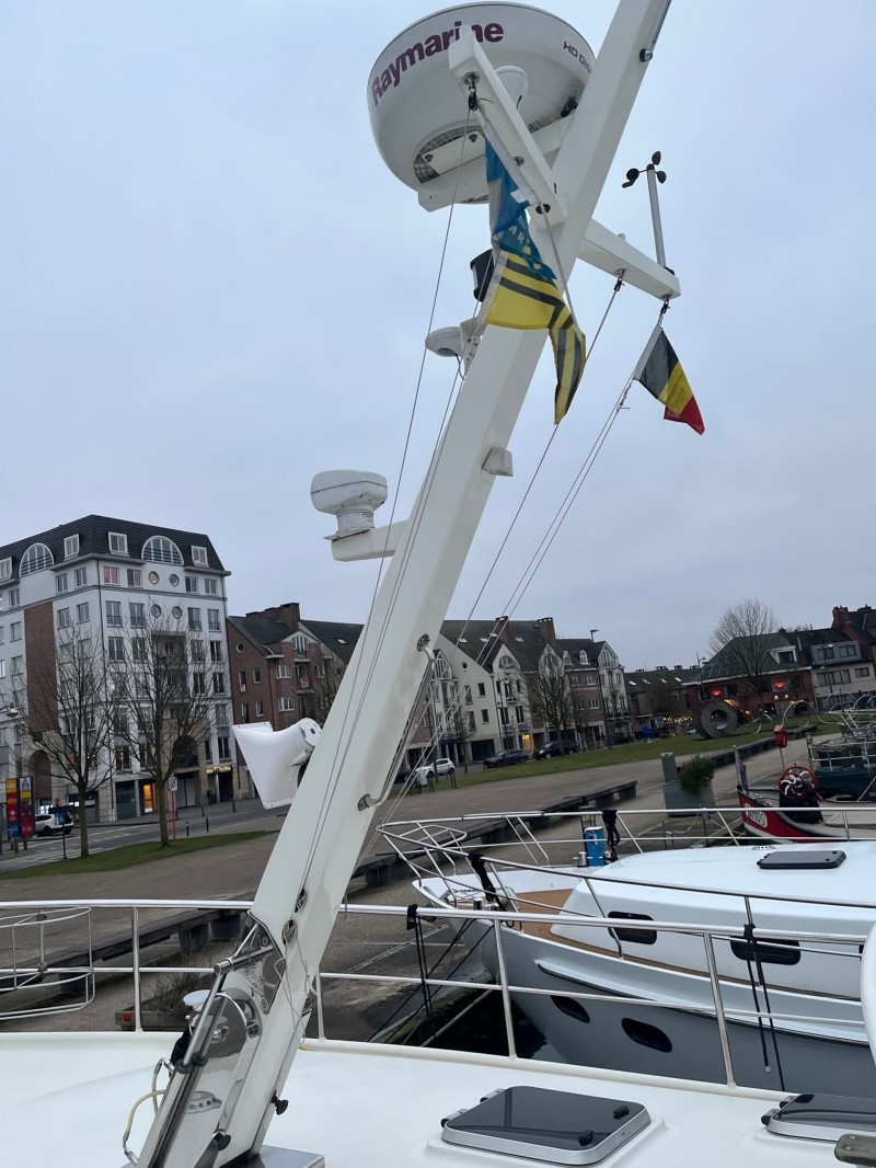 Außerdem ist die Solaris mit Schwerlastpollern, Teakdeck und Zentralheizung ausgestattet. Die Außensteuerung ist mit Raymarine Navigation ausgestattet und hat eine abschließbare Markise mit Bimini.