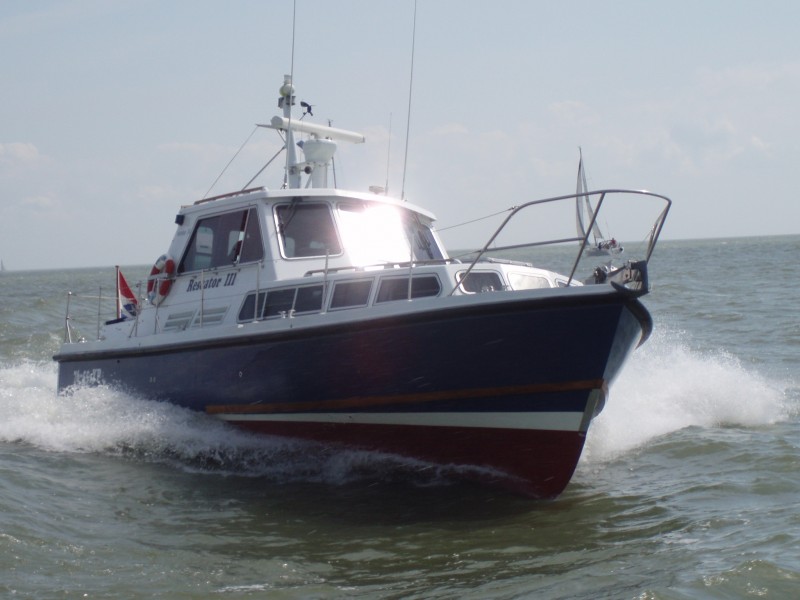 GRP motor yacht named "BB Pilot", built in 1980 by F. Booker Marine Barnsley in Great Britain. Dimensions approx. 10,40 x 3,30 x 1,10 mtr., headway approx. 2,80 with mast and radar down. Semi V-shaped blue hull. GRP superstructure, aluminium framed windows, displacement approx. 9 tons, fuel capacity approx. 1000 liter, drink water capacity approx. 800 liter.