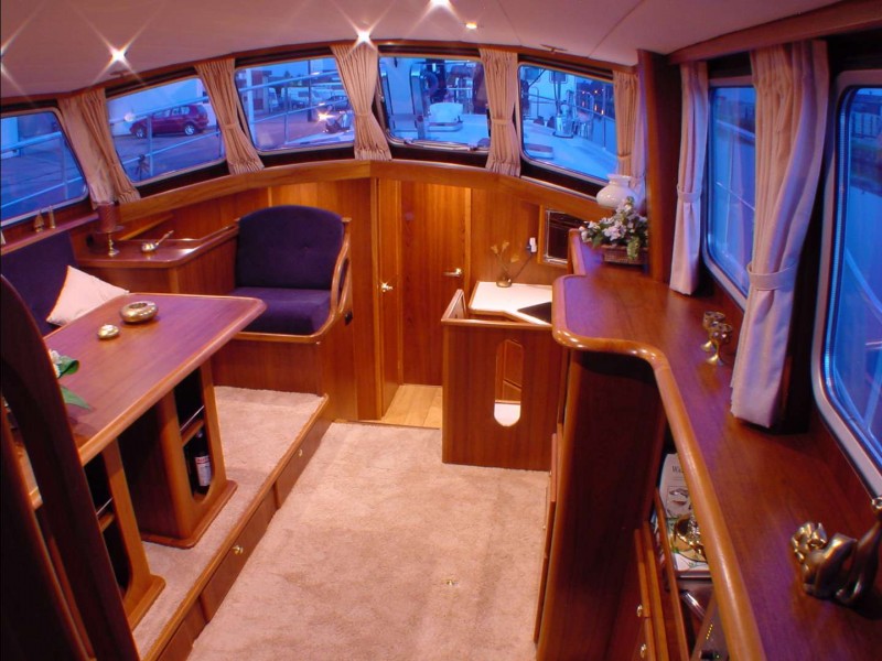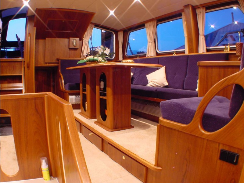 Vom “Campagnedek” ist über eine gut schließbare Tür der Salon zu erreichen. Der 5-stufige Niedergang befindet sich direkt an Steuerbord. Dadurch geht kein kostbarer Stauraum verloren. Das Salonsofa mit Tisch dient gleichzeitig als Dinette. Die Einheit steht auf einem Sockel. Sechs Personen finden hier komfortabel Platz.