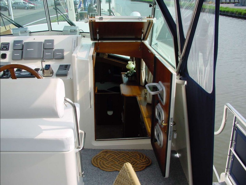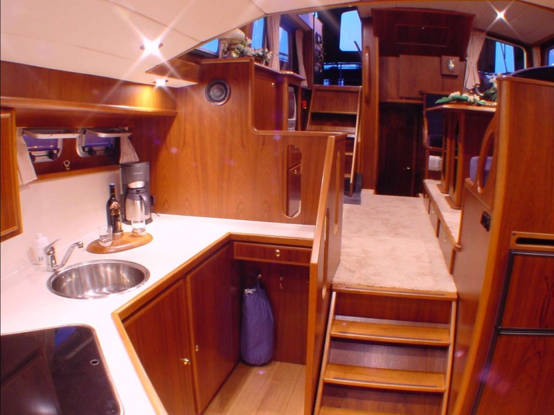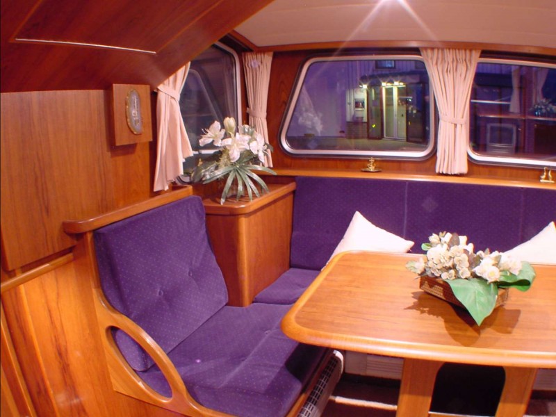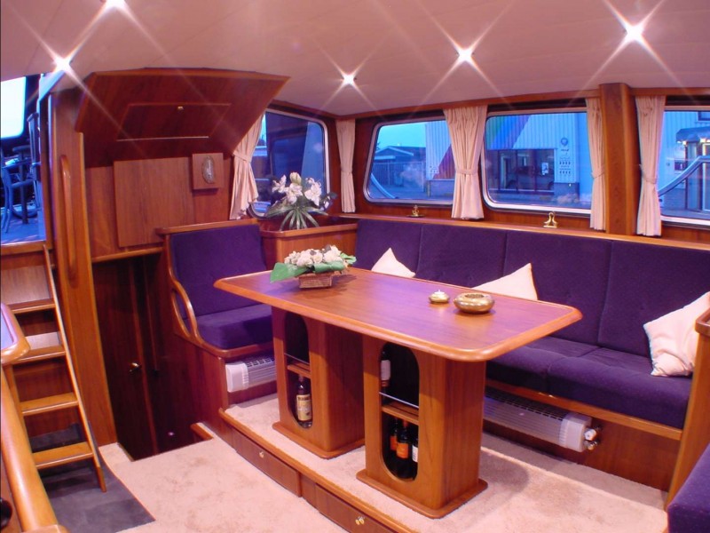Vanaf het campagnedek kan men via een goed afsluitbare aluminium deur de salon bereiken. De 5-treden trap is direct aan stuurboord geplaatst zodat kostbare bergruimte niet verloren gaat. De salonbank met tafel, welke tevens als dinette dienst doet, is op een hoger gelegen plateau geplaatst. Hier kunnen comfortabel 6 personen plaatsnemen waarbij ook het zicht naar buiten royaal mag worden genoemd.