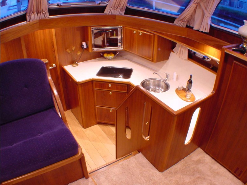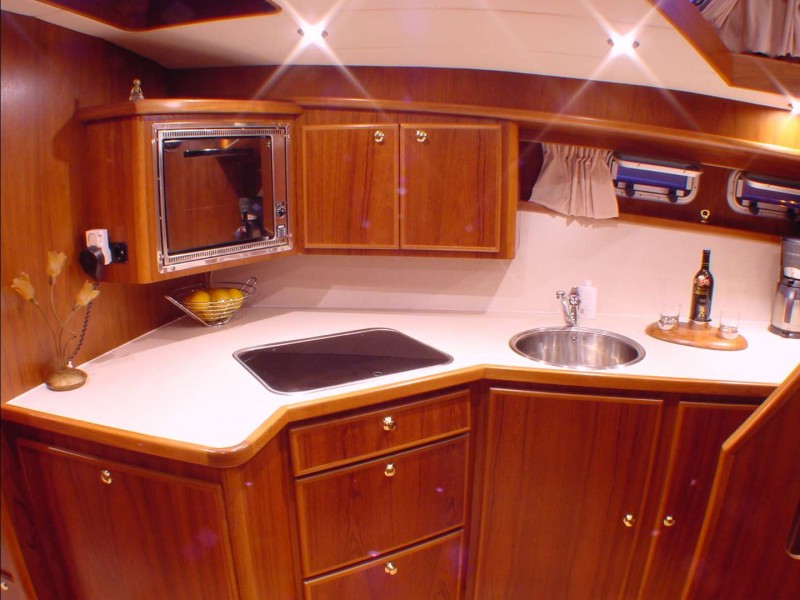 Afdalend vanuit de salon is aan stuurboord de kombuis geplaatst met een L-vormig werkblad. Volop kastruimte is aanwezig evenals diverse laden voor het bestek. Optioneel kan hier, netjes achter een deur, de wasmachine/droger combinatie worden geplaatst zodat langer verblijf aan boord tot de mogelijkheden behoort. Het ergonomisch opgestelde werkblad biedt genoeg ruimte terwijl toch kookplaat en spoelbak op de juiste wijze zijn aangebracht. Middels het open karakter in het interieur van de Kuster C-42 is er vanuit de salon direct contact met de kombuis.