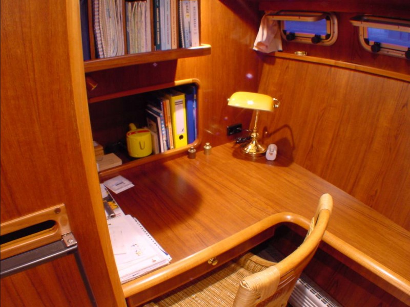 Aan bakboord, tegenover de kombuis, bevindt zich de kantoorruimte. Een ruim bureaublad biedt plaats aan kaarten, boekwerken en natuurlijk de laptop