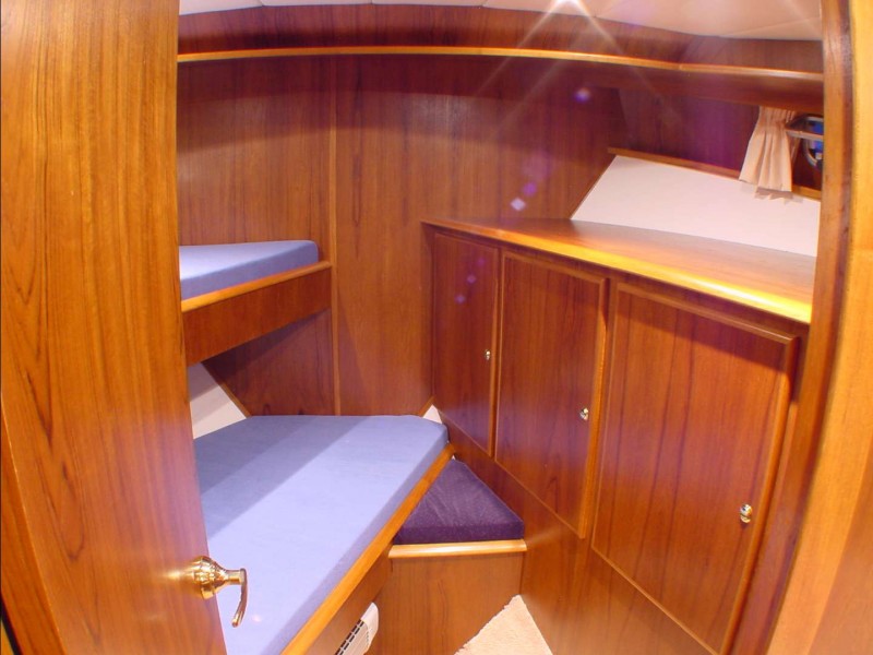 De gastenhut met ruime omkleedmogelijkheden bevindt zich in de voorpunt. Naast volop bergruimte voor kleding en schoeisel is aan bakboordzijde een stapelbed geplaatst. Standaard worden alle bedden voorzien van lattenbodems en dikke matrassen. Een extra zitje met zitkussen biedt veel comfort bij het omkleden.