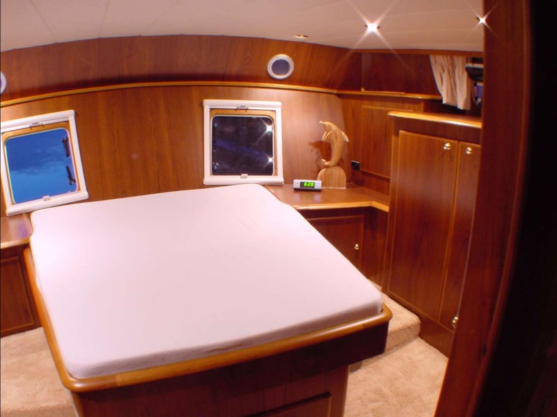Onder het achterdek bevindt zich de riante eigenaarshut met toilet- en douche ruimte. Hoewel alle ruimte is benut is er toch volop stahoogte in de eigenaarshut. Het king-size bed dat grenst aan de spiegel waarin 2 vluchtluiken zijn aangebracht, staat centraal opgesteld. Hierdoor kan de lade onder het bed prima worden benut voor bijvoorbeeld het wasgoed. Naast het bed is aan beide zijden een verhoging aangebracht om een ideale instap naar het bed te bieden. Aan stuurboord bevindt zich een volledige kastenwand met zowel hang- als leg mogelijkheden. Aan bakboord is tevens een kastenwand geplaatst.