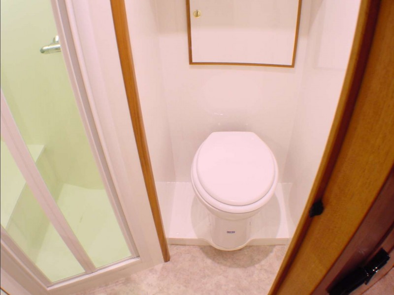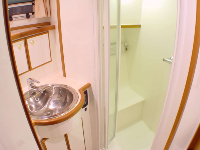 De natte cel is compleet uitgevoerd met een elektrisch toilet en wasbak. De separate douchecabine kan worden afgesloten middels een veiligheidsglas deur. De douche is voorzien van een extra zit, waardoor comfortabel douchen altijd mogelijk is. Eénhandel mengkranen bieden nog meer comfort, evenals de vele opbergmogelijkheden in de toiletruimte. Ventilatie en lichtinval is ruim aanwezig middels zes klappende patrijspoorten en de goed toegankelijk vluchtluiken in de spiegel.